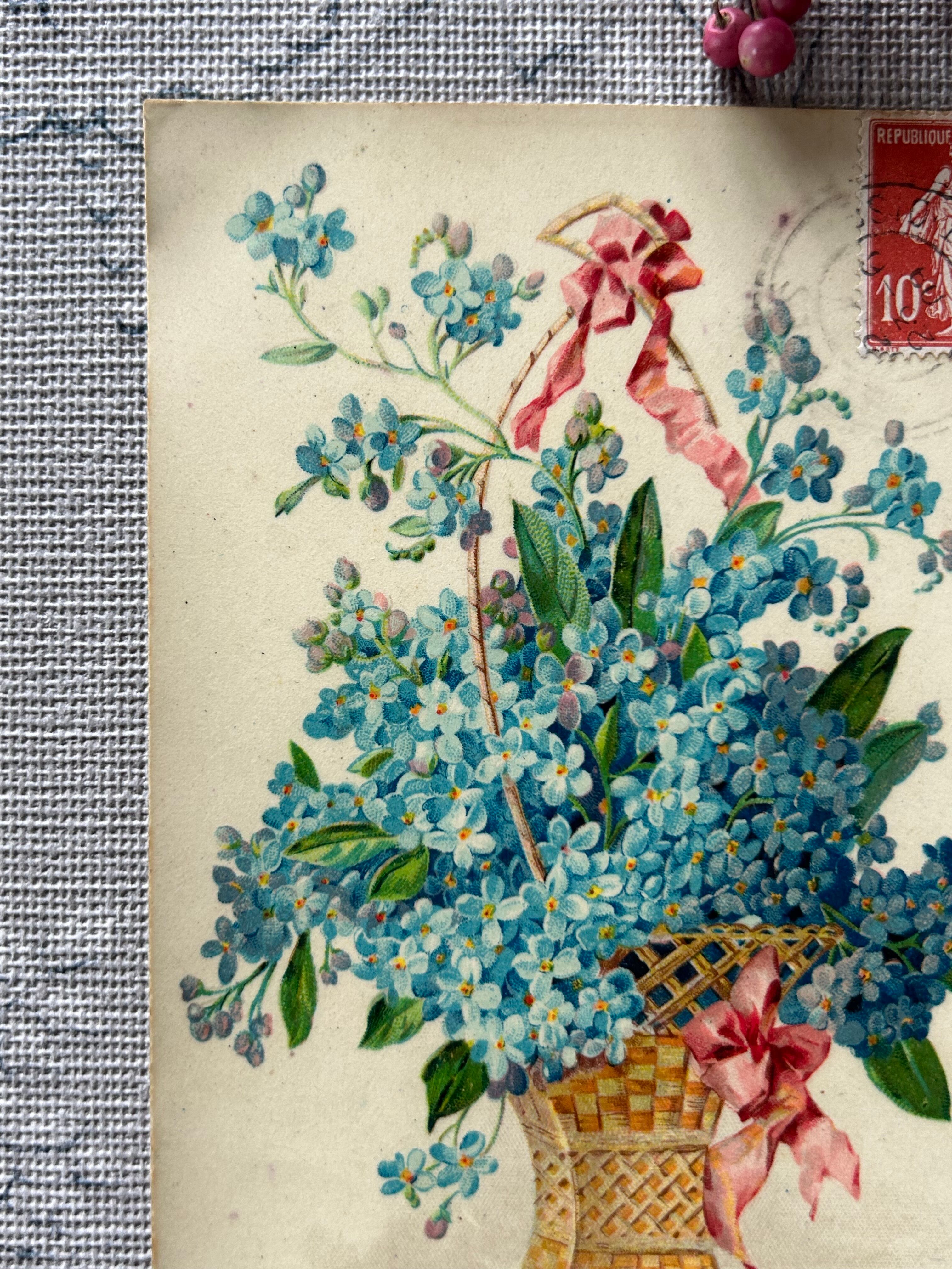 アンティークカード Bonne Fete 勿忘草 花かご Ruban リボン 1909年 12KO60