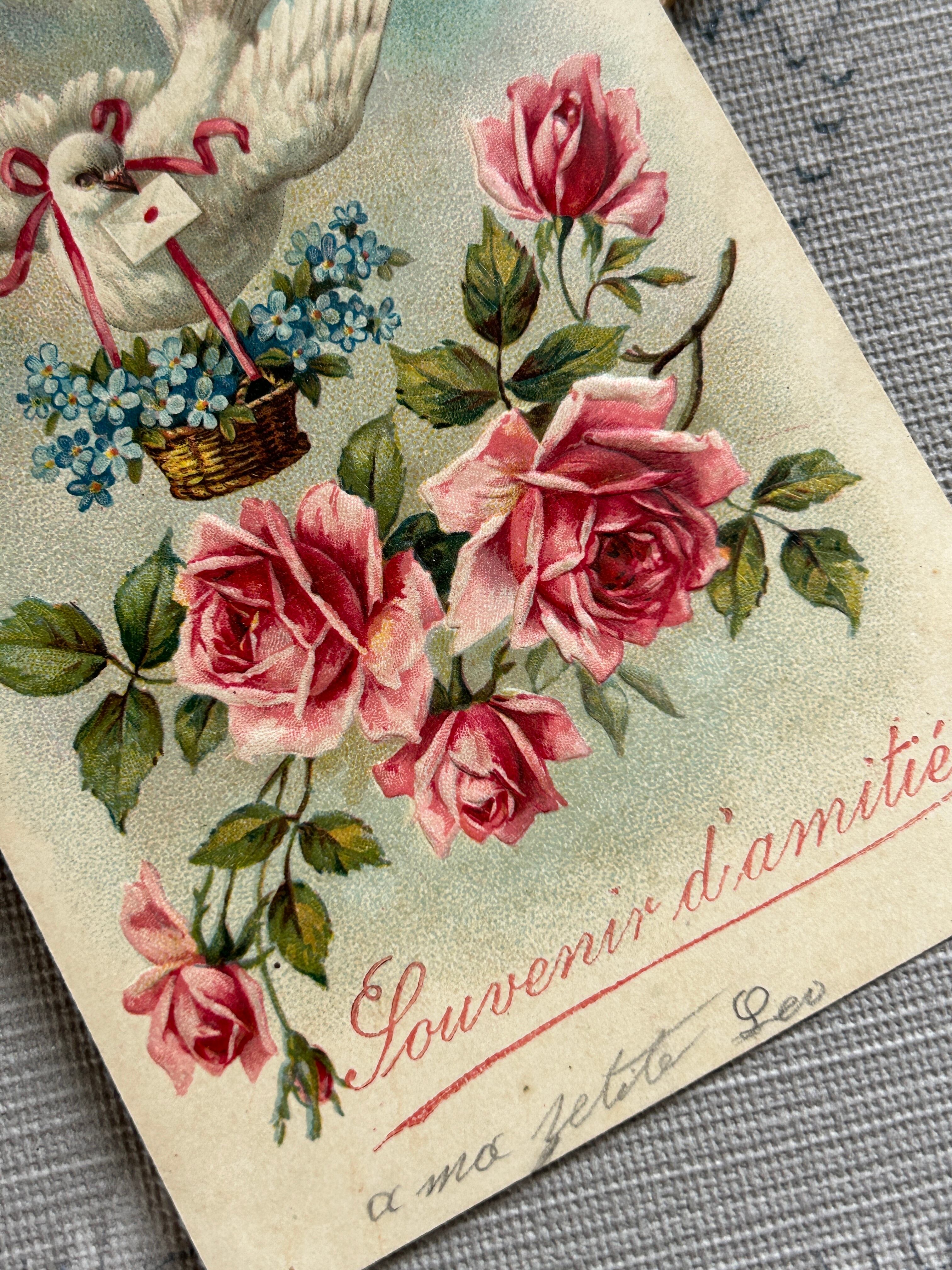 アンティークポストカード 白鳩と勿忘草のフラワーバスケット Rose エンボス 1908年 1KO151