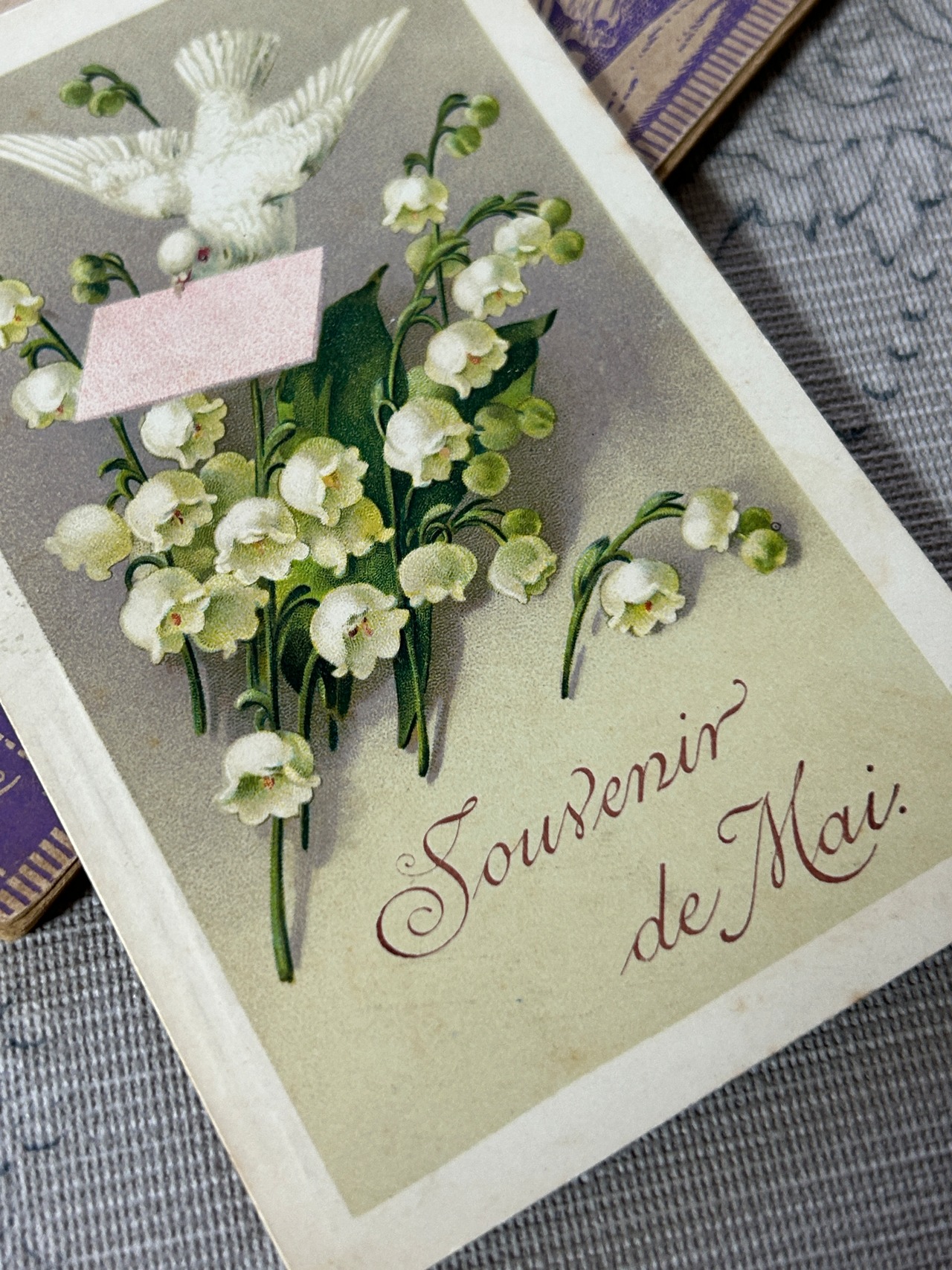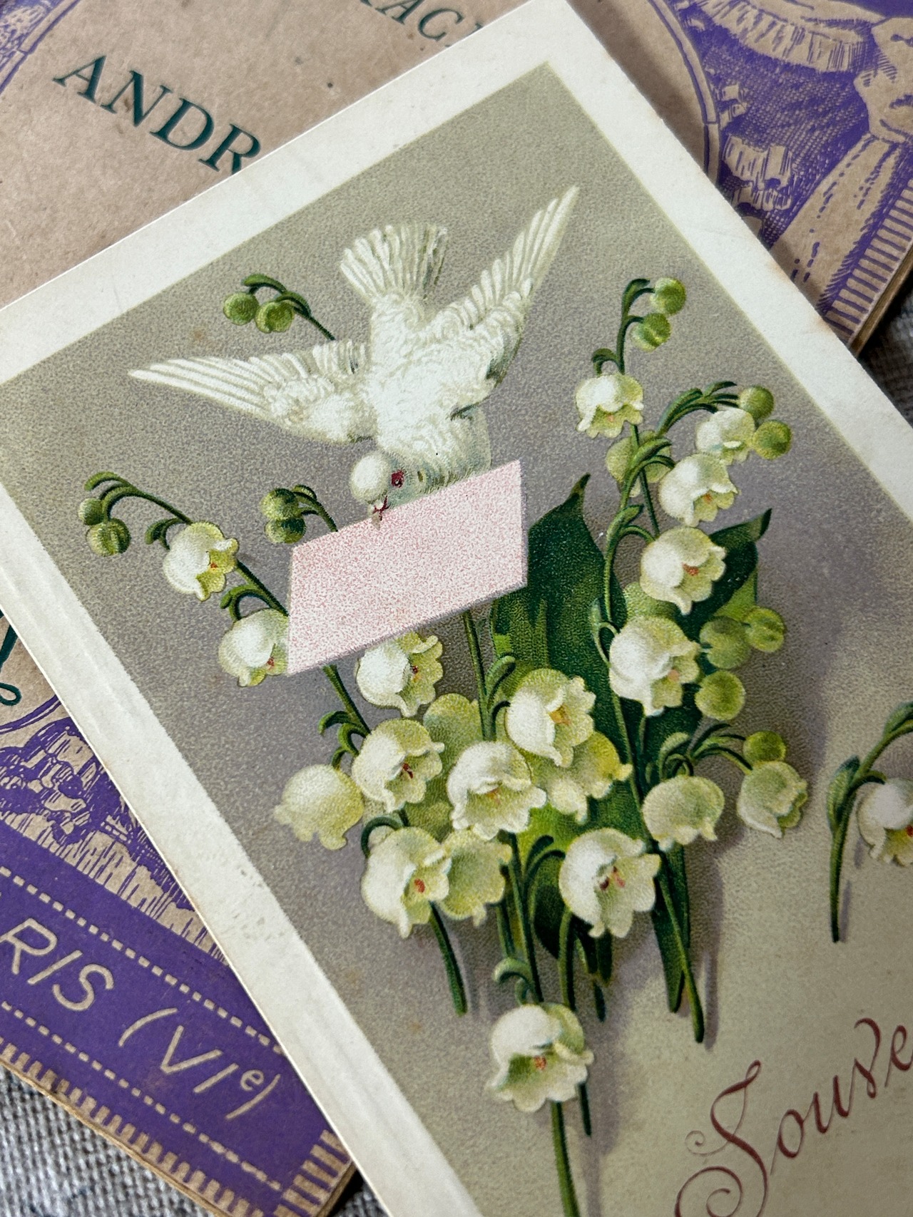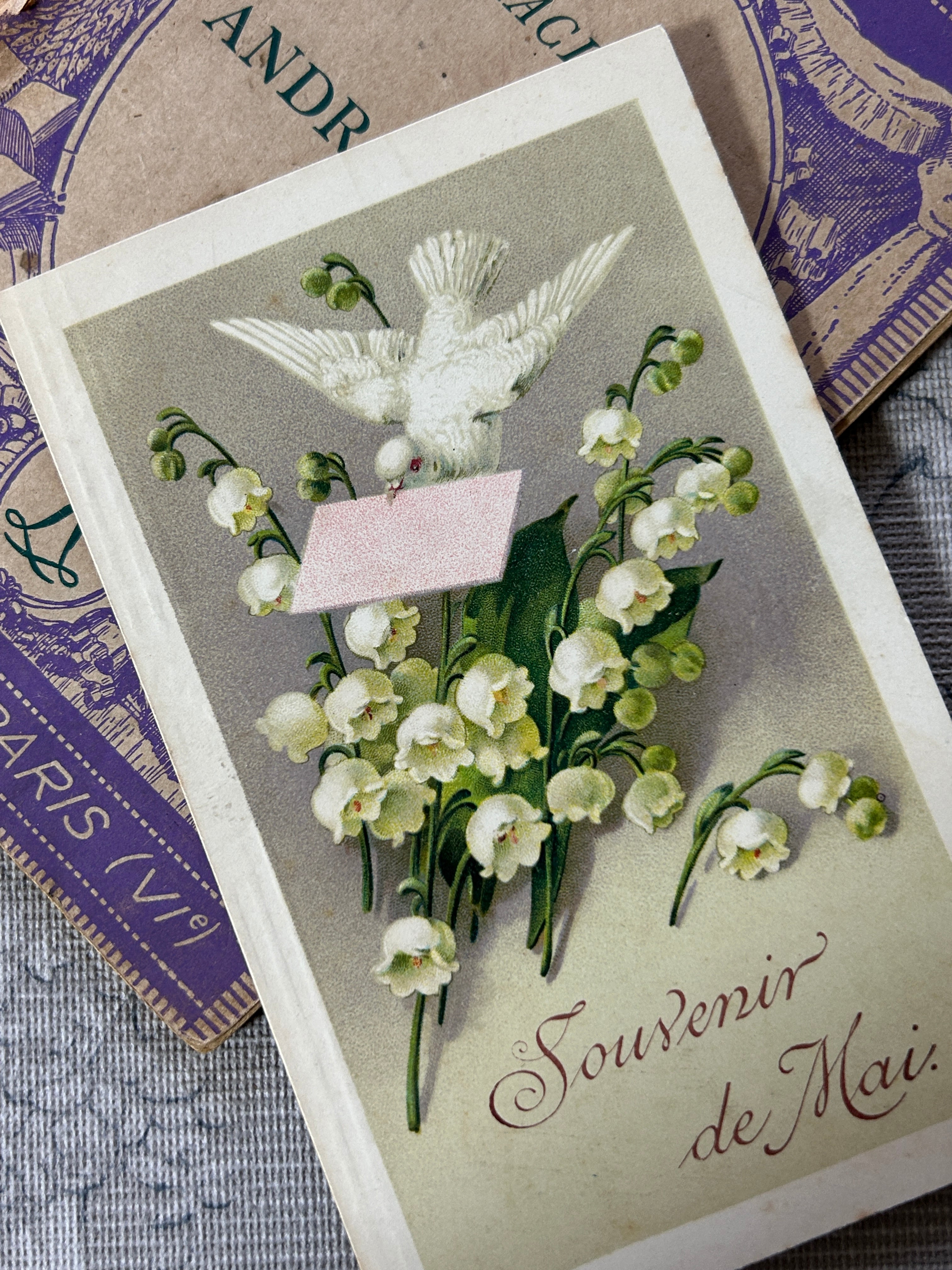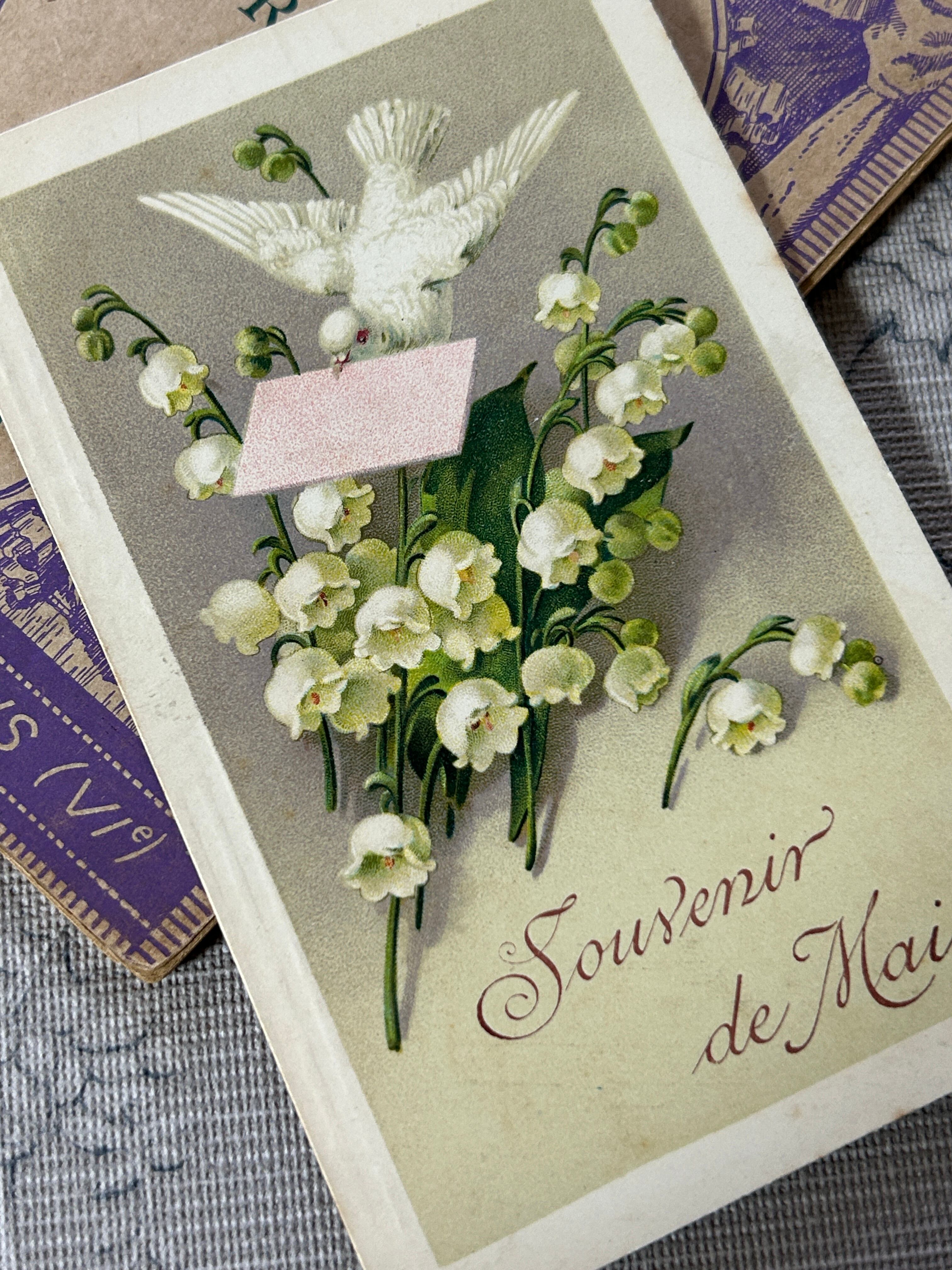 アンティークポストカード Souvenir de Mai Muguetと白鳩1 スズラン KO216