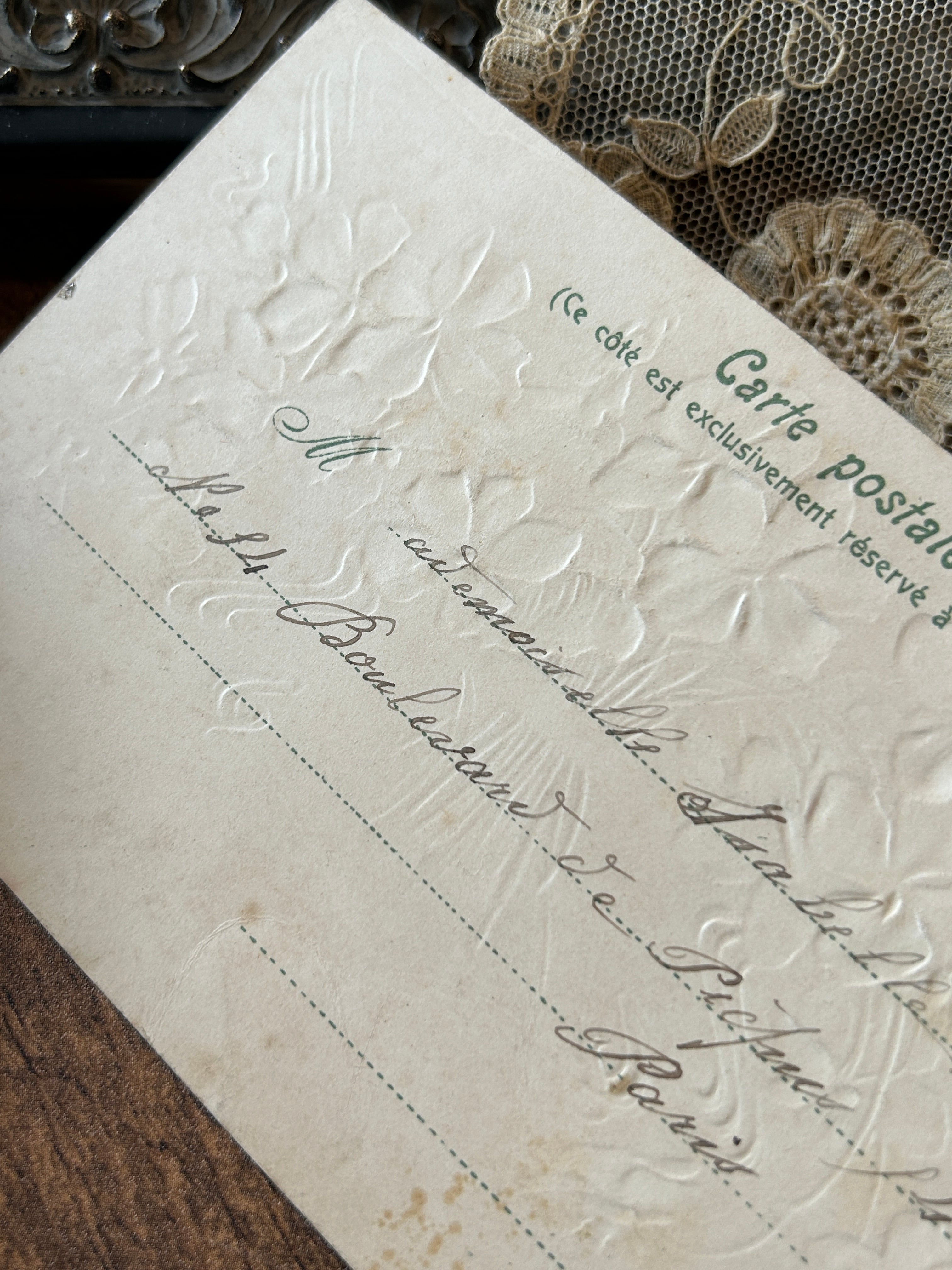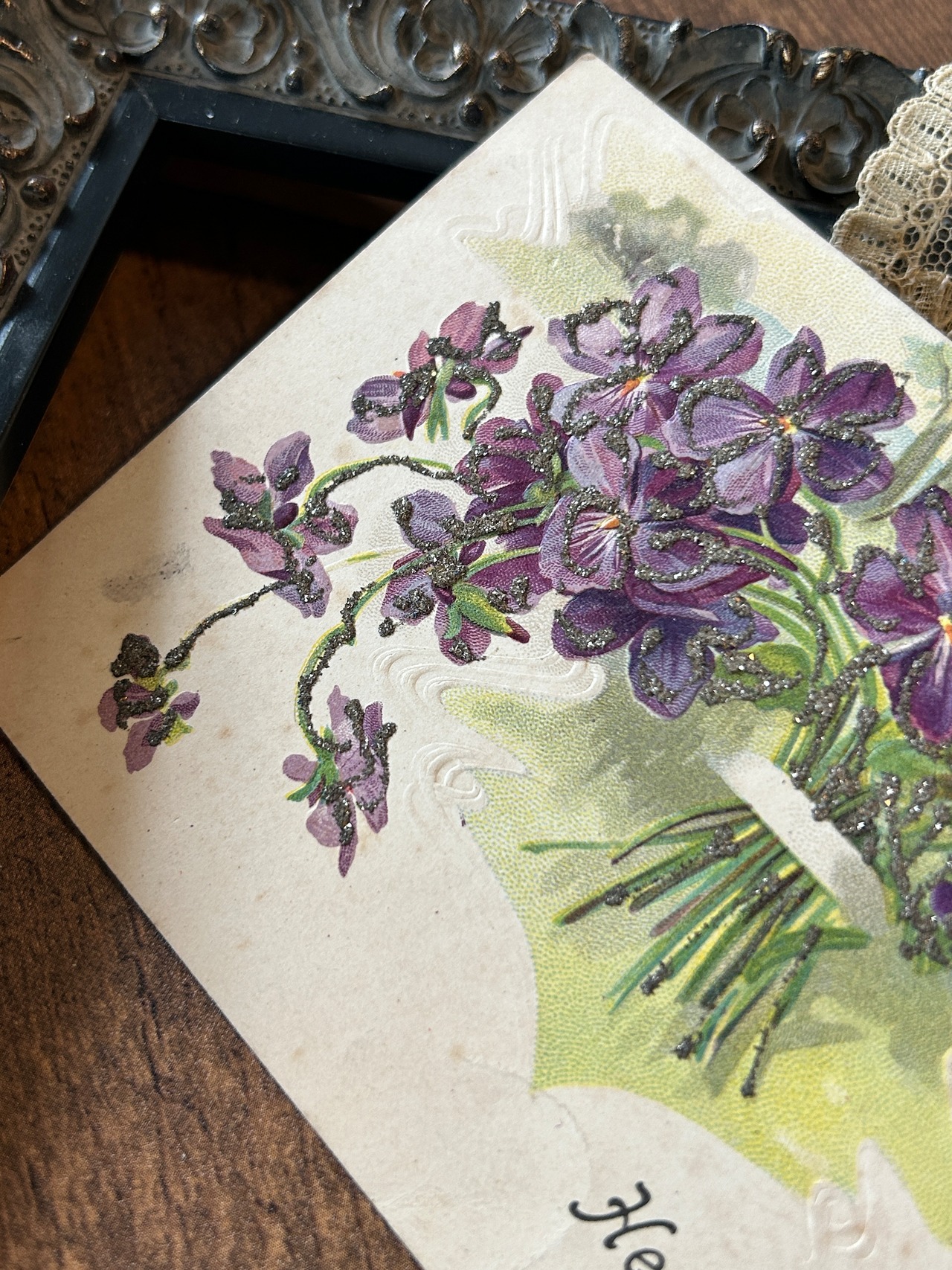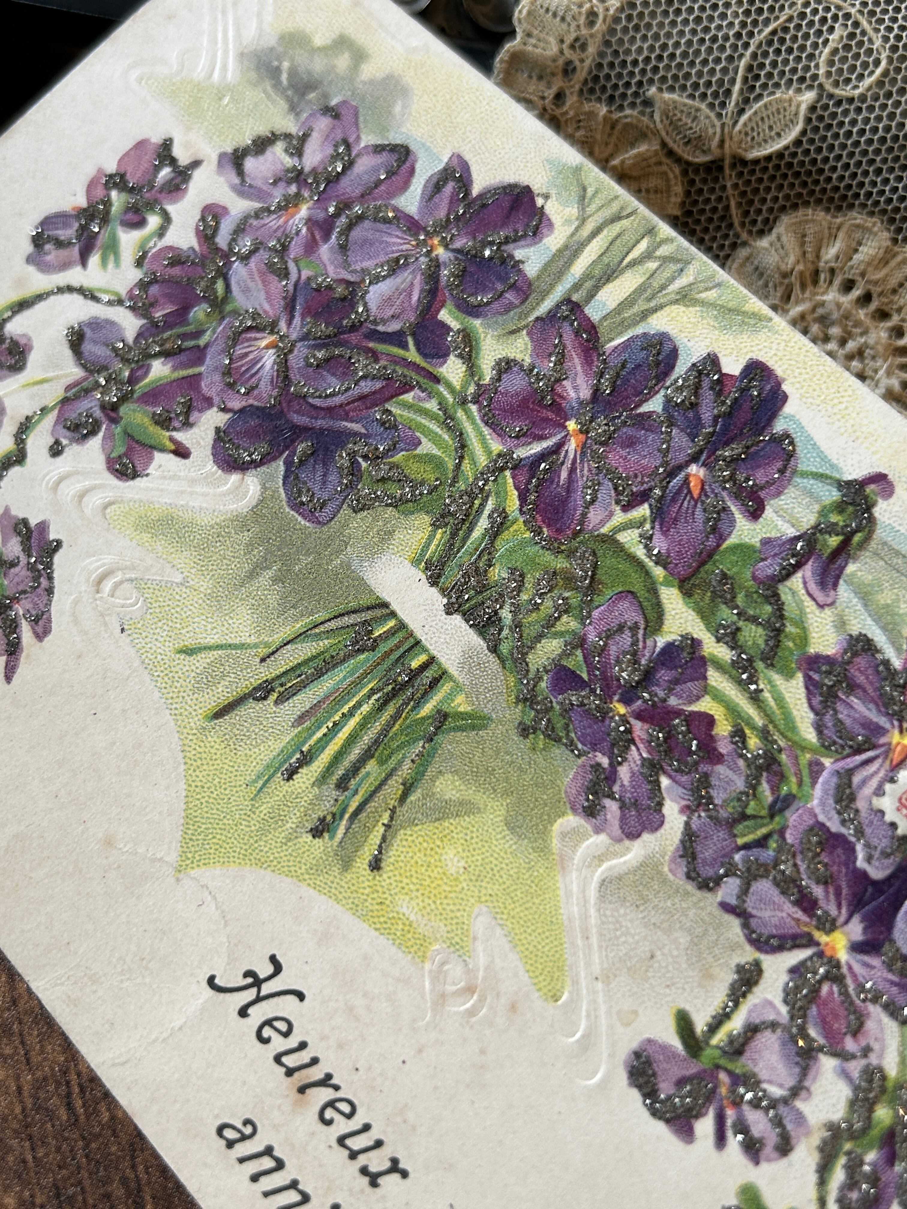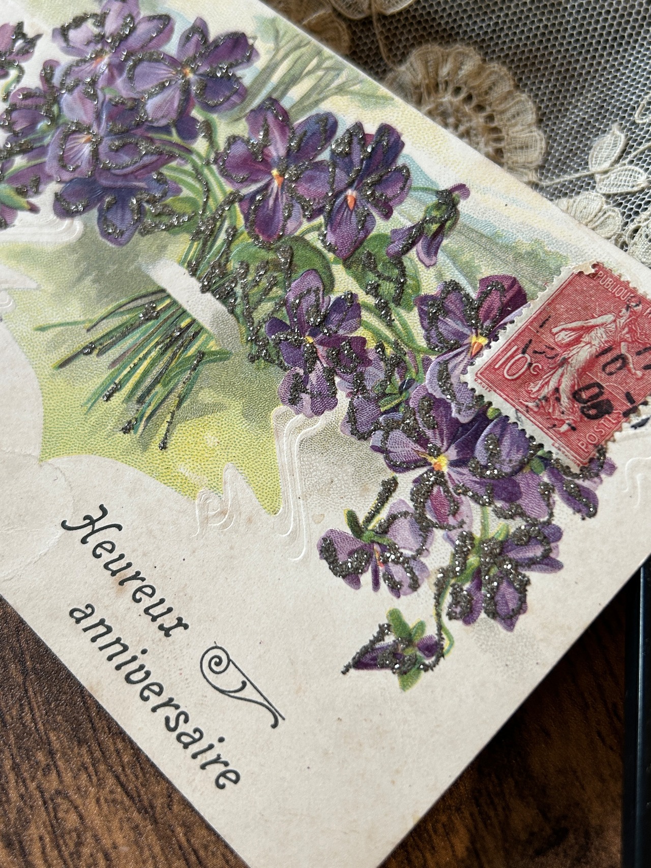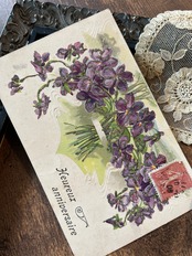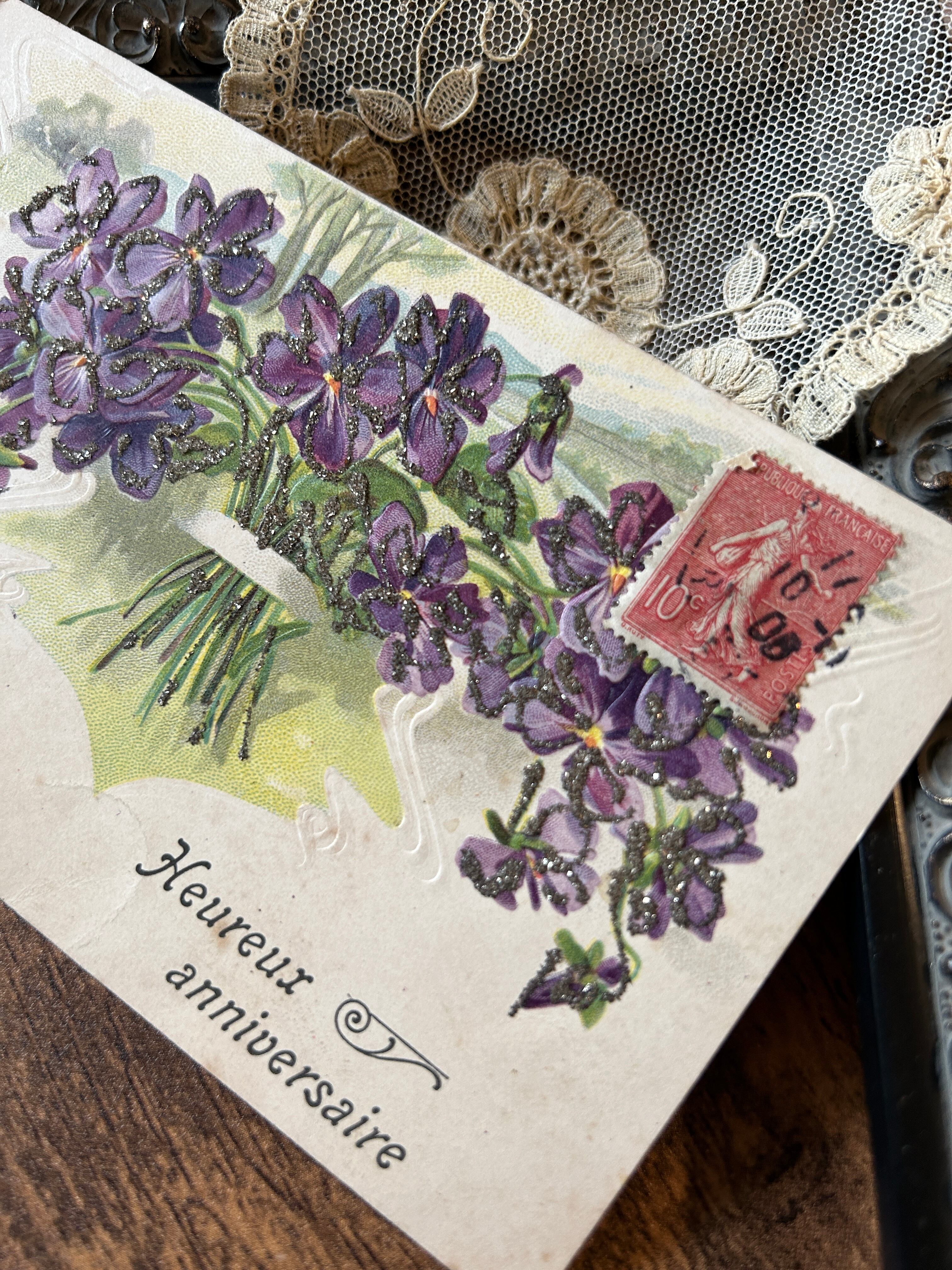 アンティークポストカード Heureux anniversaire スミレのブーケ violette グリッター 1KO251