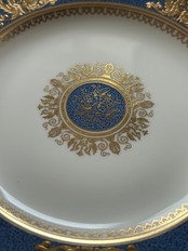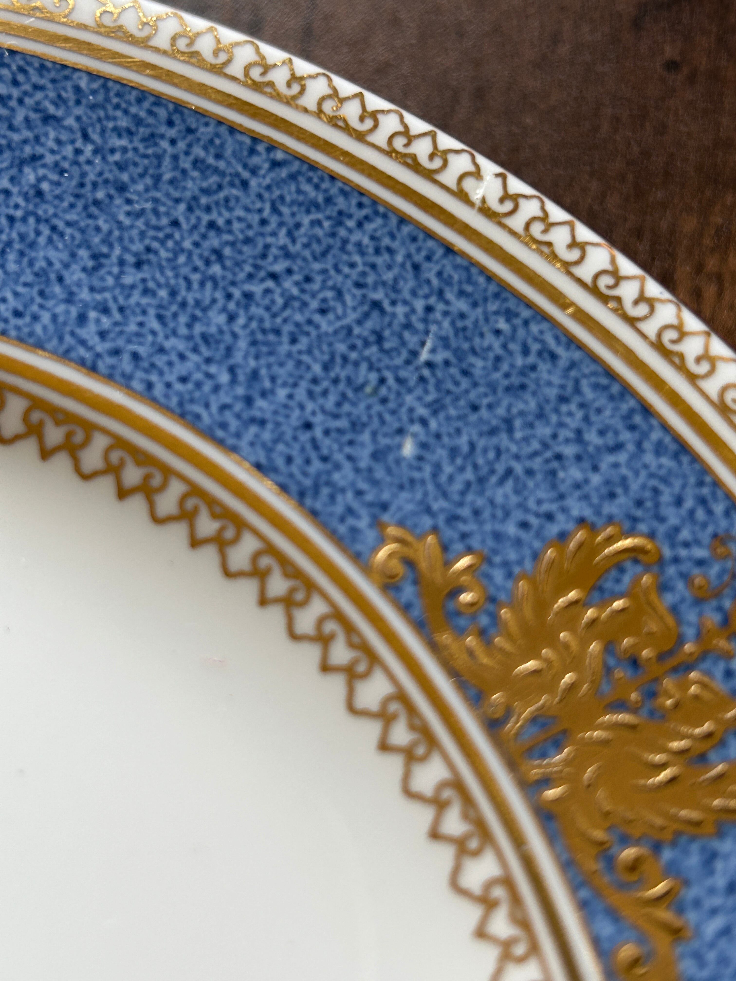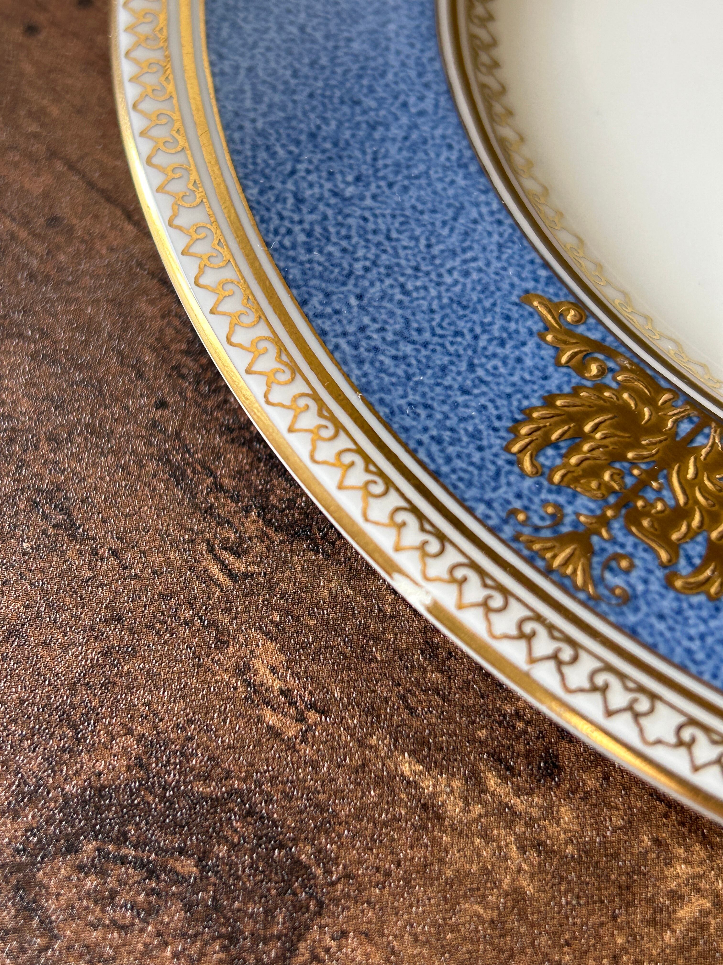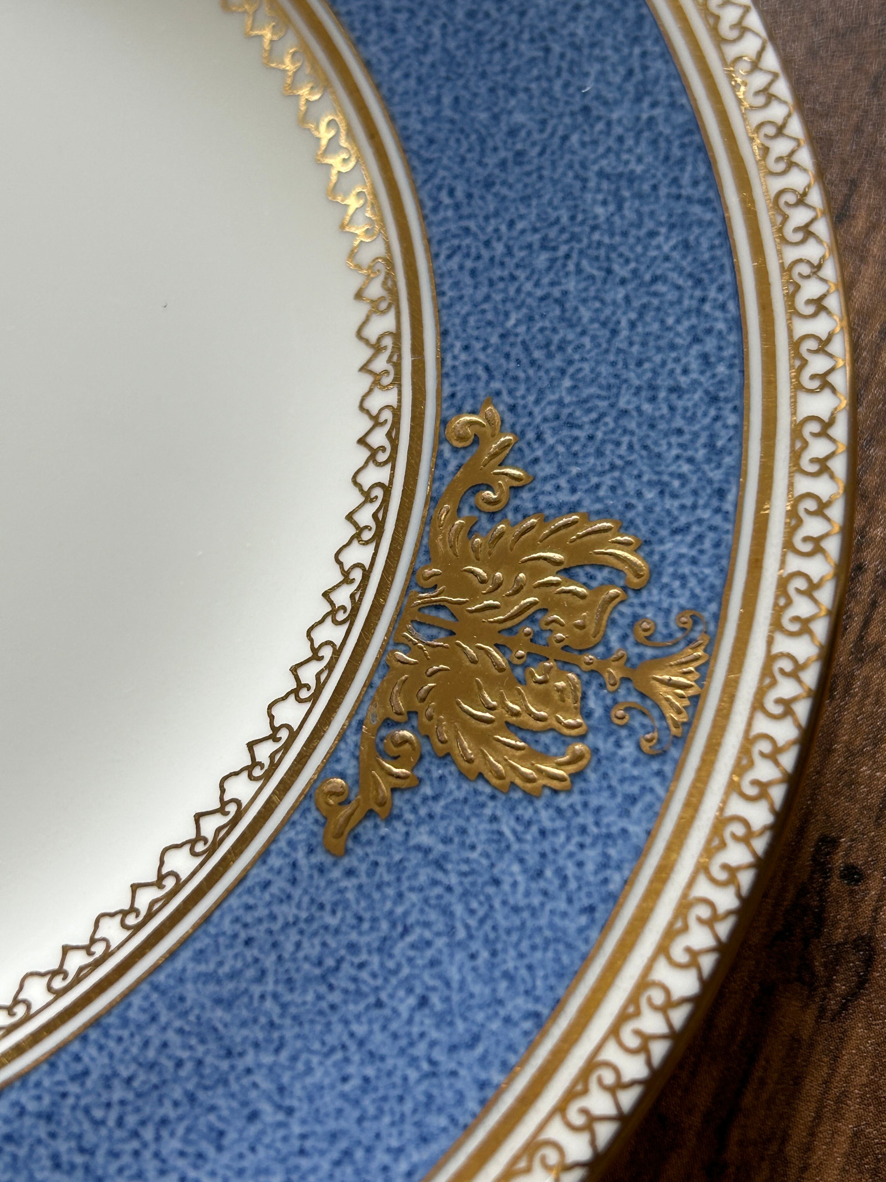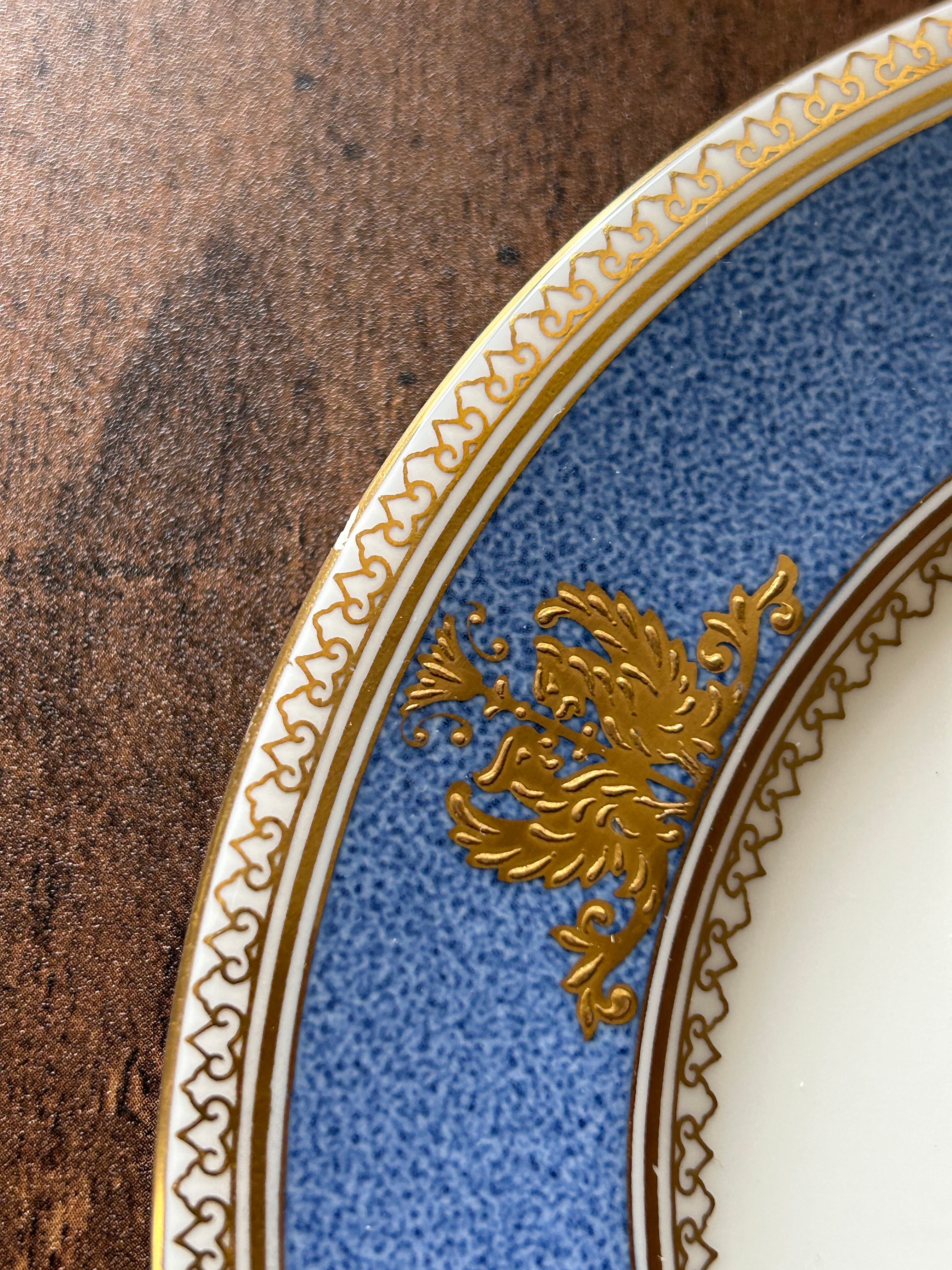 パウダーコロンビアは22金が使用されているウェッジウッドの中でも有数の豪華で最高級なパターンです。対称的に向かいあった二匹のグリフィンのデザイン。