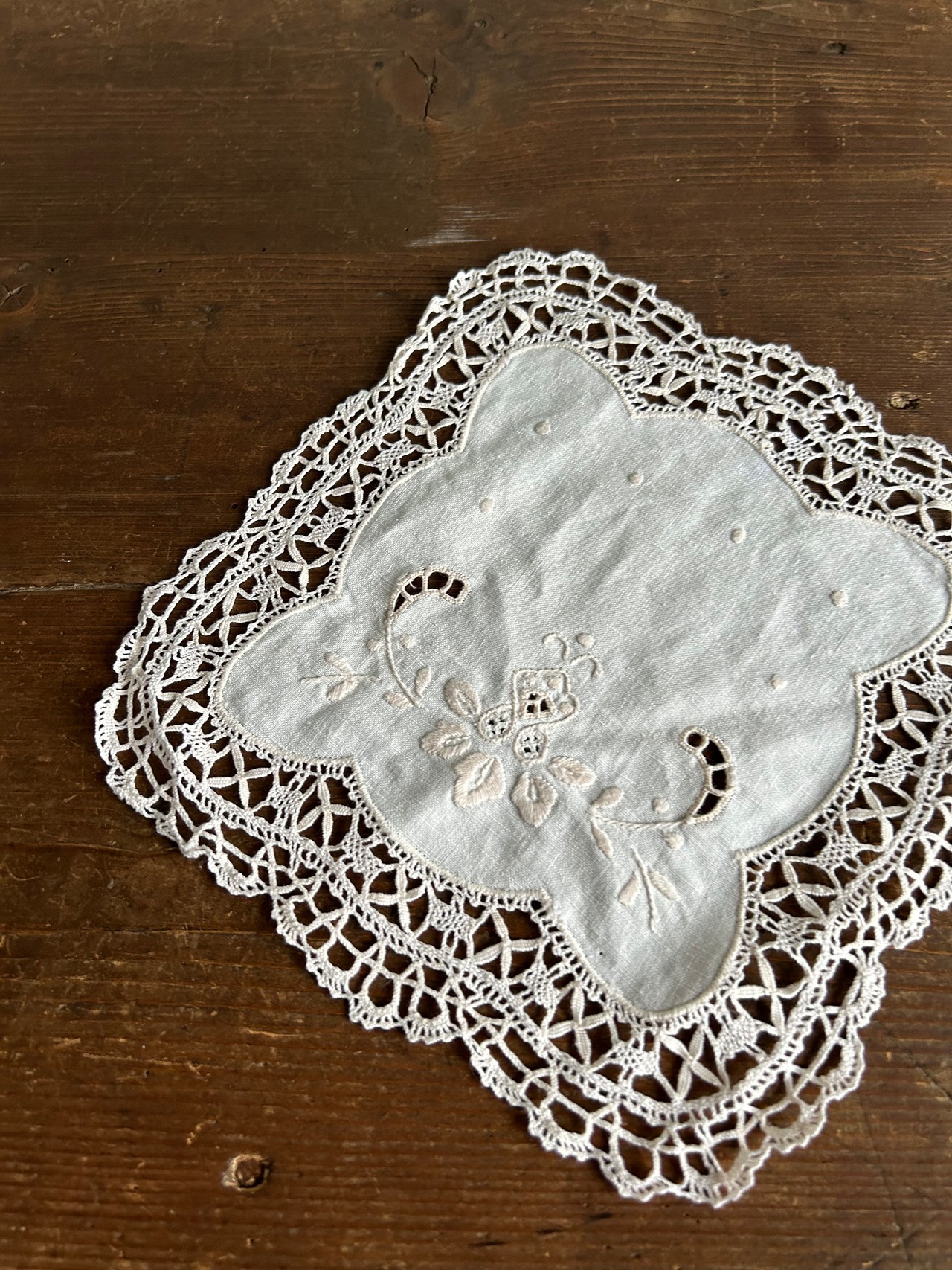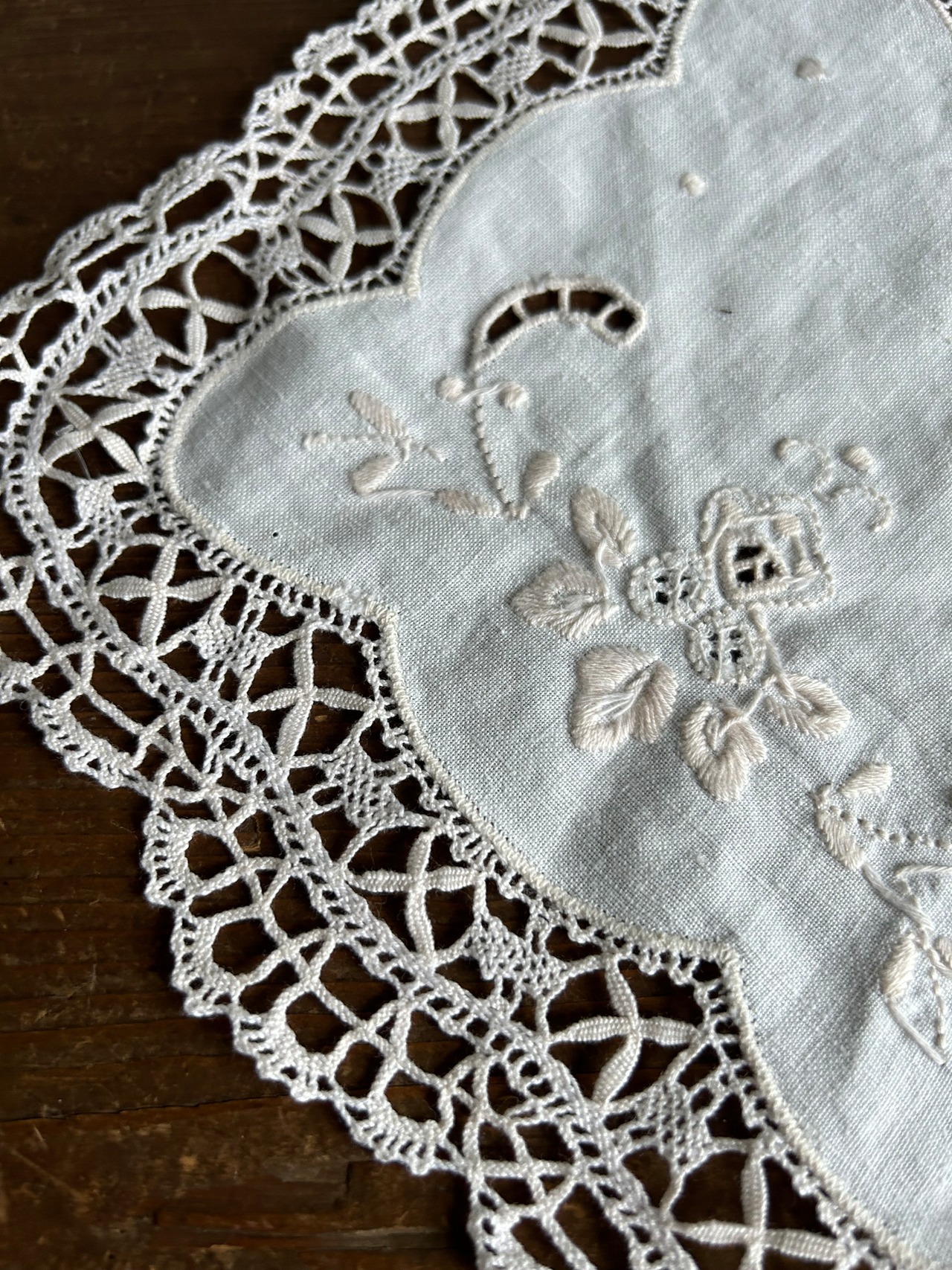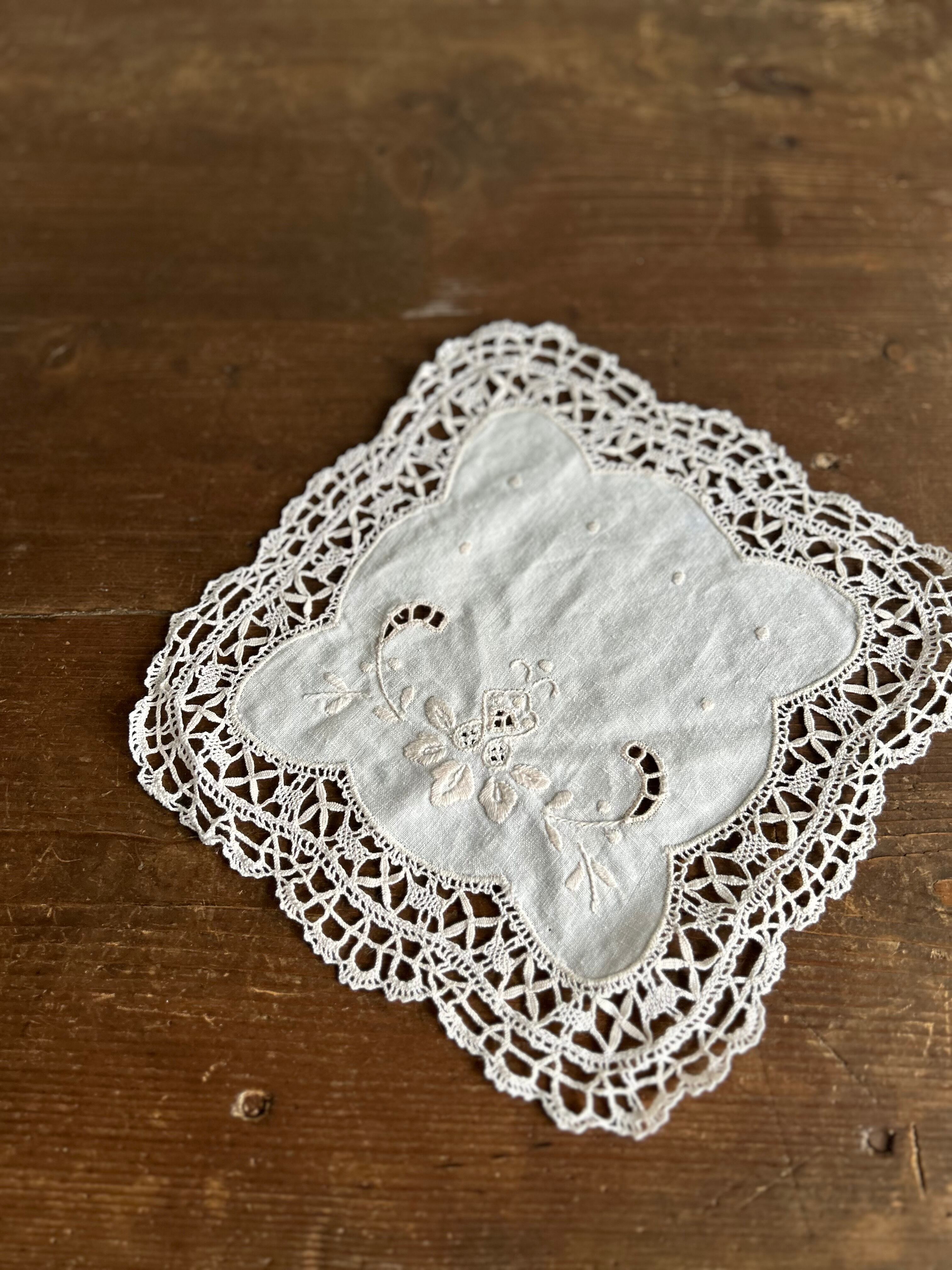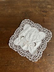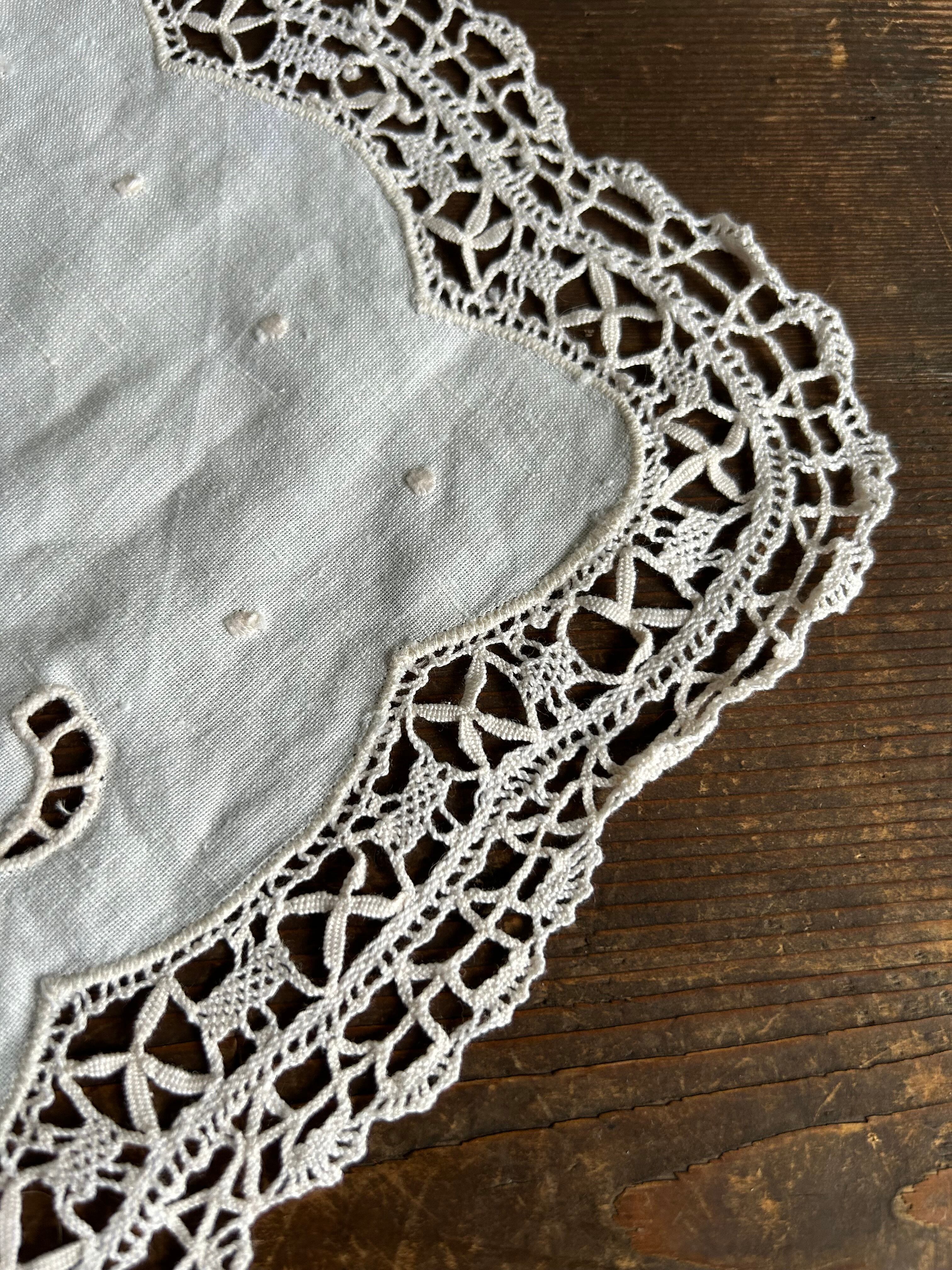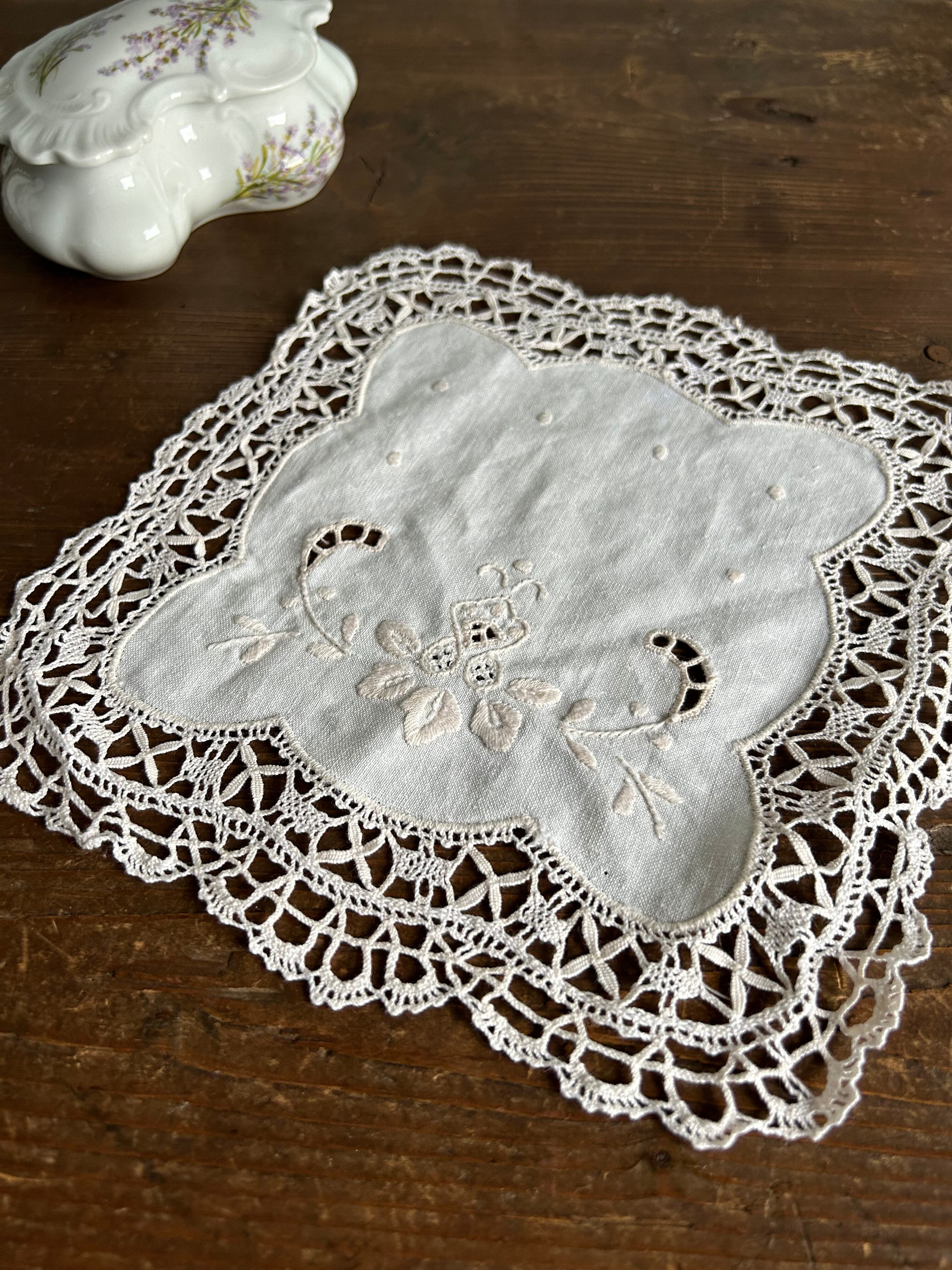 リネン地にカットワークと手刺繍、縁周りをボビンレスで縁取ったドイリーです。